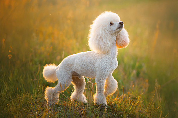 Poodles can be identified through their physique – a square-like body, long neck, and straight back. They are also famous for their iconic curly single coat.